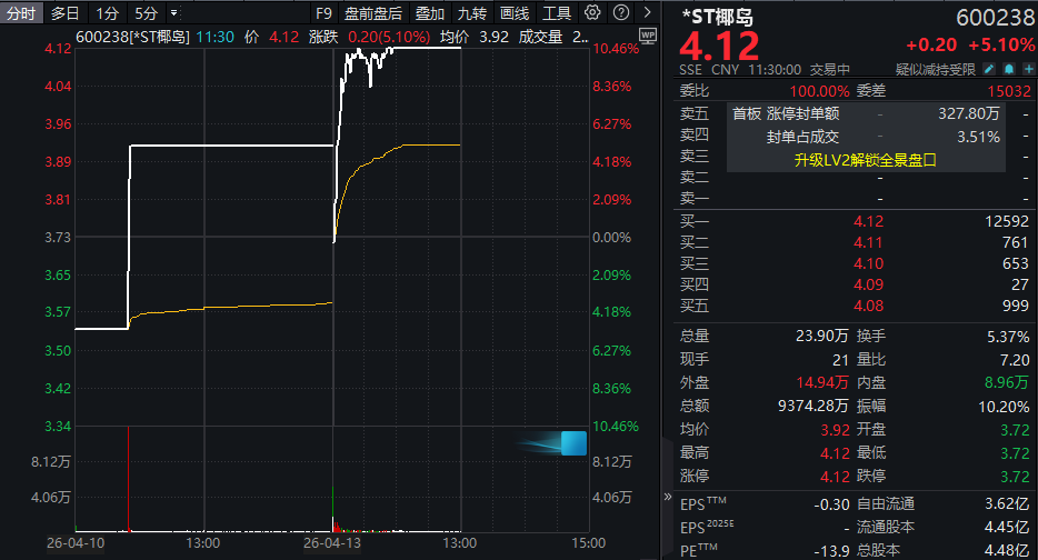 继上周五后,“保健酒第一股”*ST椰岛(600238)13日开盘再次献技“地天板”,况且两次“地天板”走势均为从跌停板直线拉升至涨停。