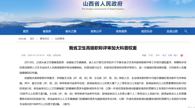 山西省出台的2026年卫生高档职称评审新规,将成为继河北、河南、四川之后,又一将科普作品看成职称评审前置条款的省份。